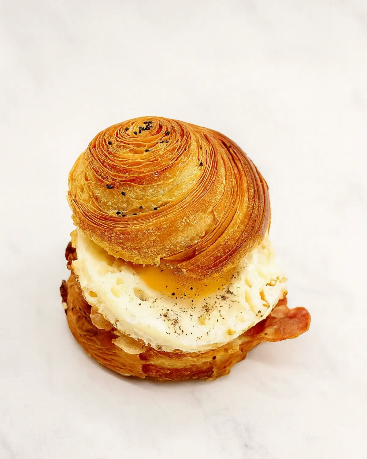 Croissant salé garni d’un œuf moelleux, de cheddar fondant et d’une mayonnaise épicée.