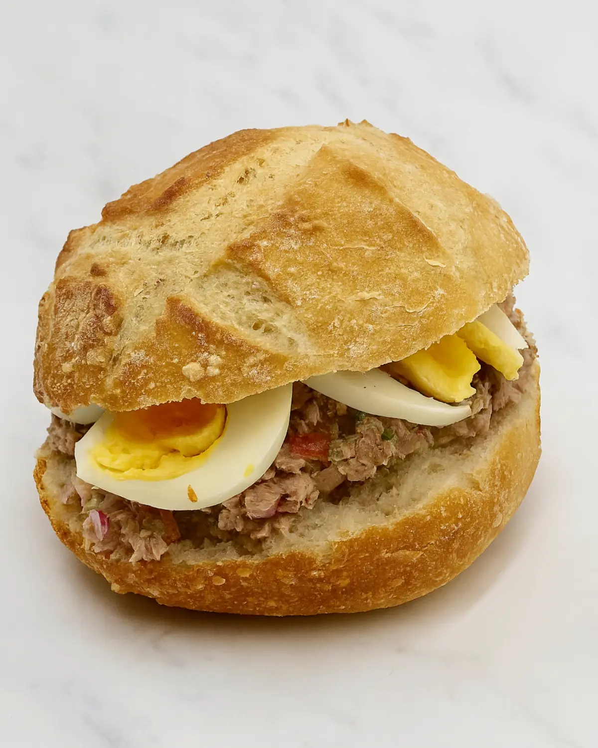 Pain rond à l’huile d’olive, garni de thon, cébette, tomates cerises, radis, œuf dur, huile d’olive et vinaigre de Xérès.
