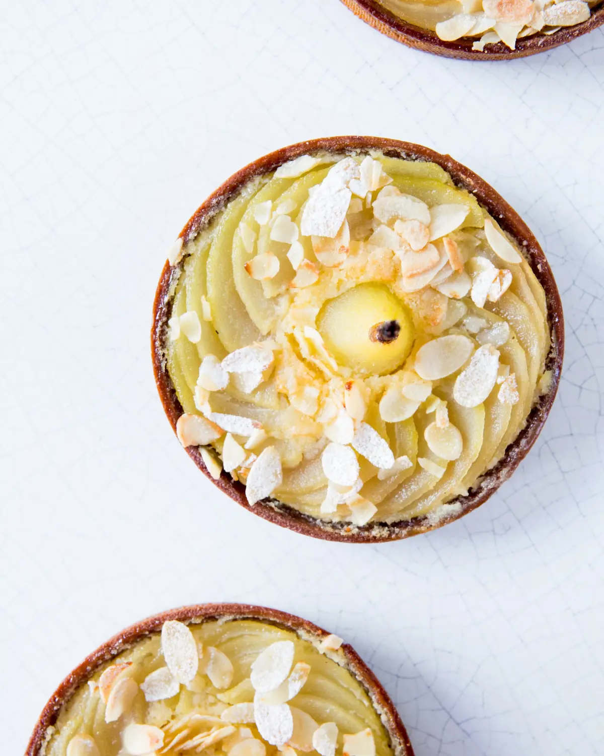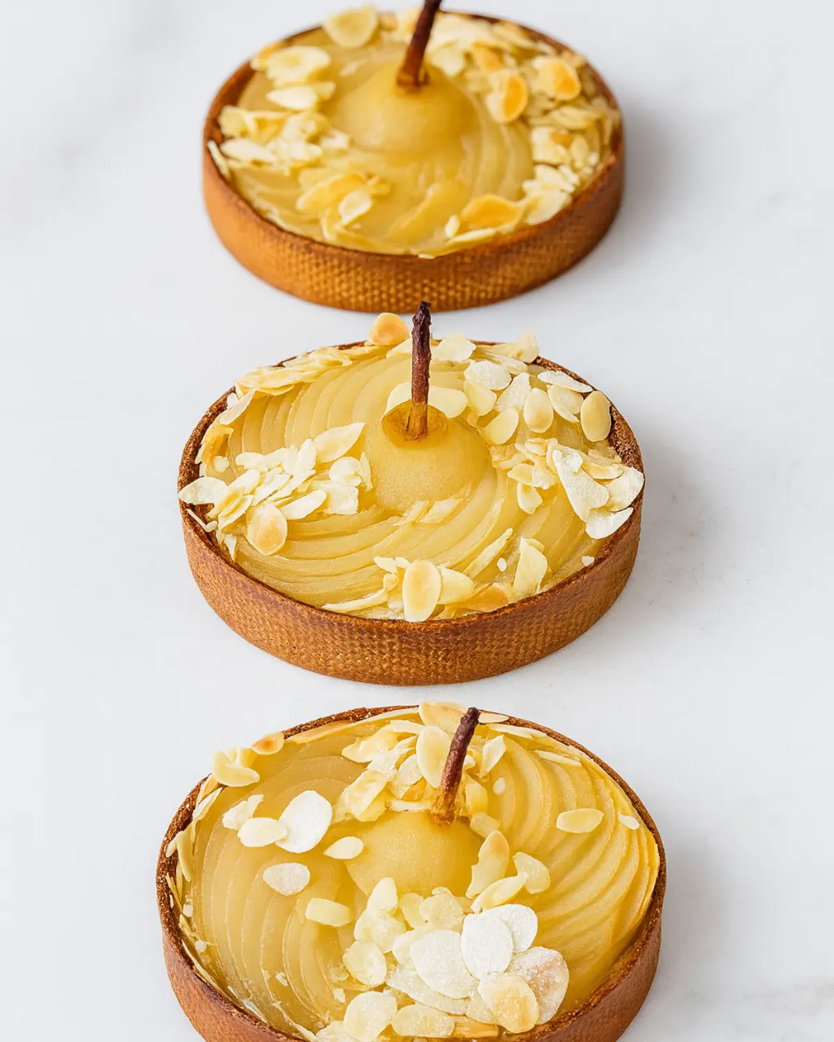 Tarte sablée garnie d’une crème d’amande onctueuse, de poires pochées à la vanille et d’un crumble amande croustillant.